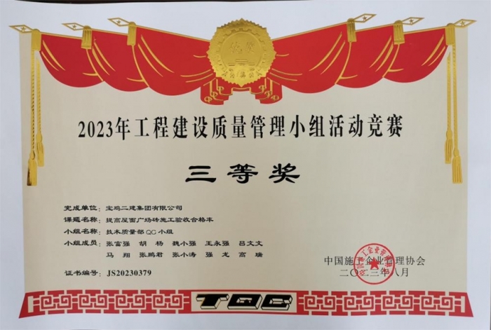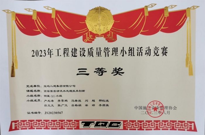 最終,碧水潤園QC小組“提高衛(wèi)生間反坎一次驗收合格率”榮獲2023年工程建設(shè)質(zhì)量管理小組活動競賽一等獎,技術(shù)質(zhì)量部QC小組“提高屋面廣場磚施工驗收合格率”榮獲2023年工程建設(shè)質(zhì)量管理小組活動競賽三等獎,明星QC小組“高層泵管清洗水處理技術(shù)創(chuàng)新”榮獲2023年工程建設(shè)質(zhì)量管理小組活動競賽三等獎。